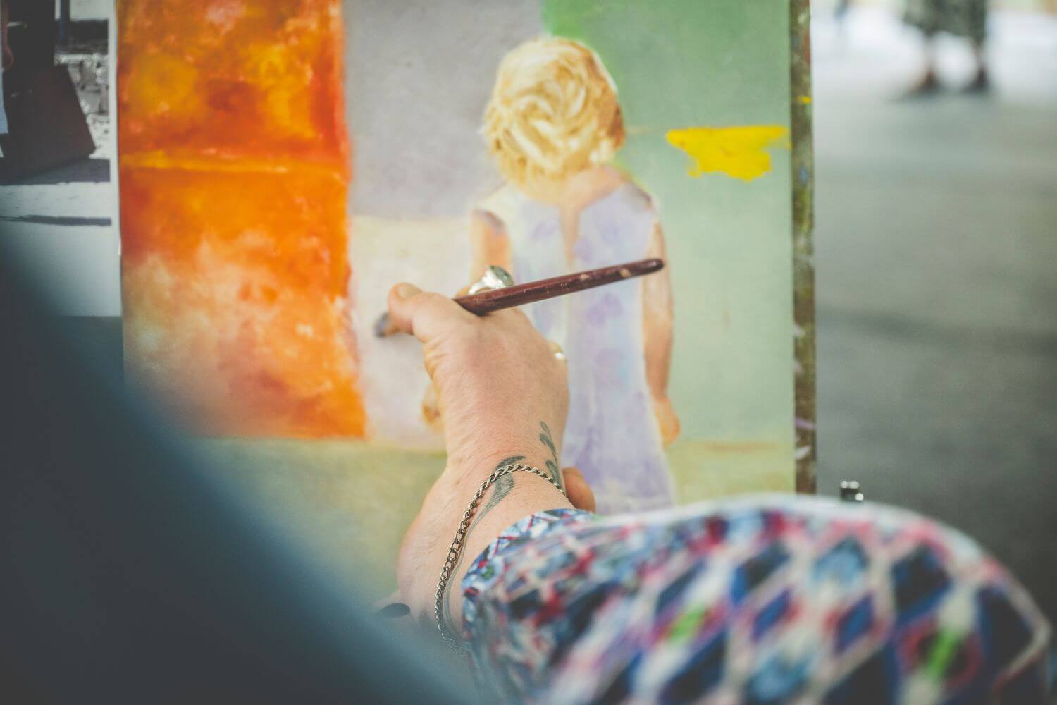 Auch beim diesjährigen gemeinsamen Malen unter Anleitung im Regensburger Hotel Includio war Sympra mit dabei. Im Gegensatz zu den Mund- und Fußmalenden, die erst bei ihrer Ankunft von dem zu malenden Motiv erfahren, hat Sympra immer schon erste Ideen im Gepäck. Das Ziel unseres Besuchs vor Augen führen wir teilweise lange Gespräche mit den Teilnehmenden, blicken ihnen bei der Arbeit über die Schulter und befragen sie zu Techniken, Stilen und Malgerät. Ebenso geht der Fotograf vor, mit dem wir gemeinsam unsere Geschichten entwickeln. Unsere Erkenntnisse fließen in das jährliche Magazin „lebensART“, einem inhaltlichen Rundumschlag des Workshops, in News und Online-Ausstellungen für die Website und in Content für den Instagram-Kanal des Verlags. Auch wenn Rahmen und Anlass des Treffens immer gleich bleiben, gehen uns die Geschichten nicht aus. Das haben wir den individuellen Wegen der Künstlerinnen und Künstler und ihren vielfältigen Talenten zu verdanken. Oder auch dem Geschäftsführer des MFK-Verlags, Florian Stegmann, der dieses Jahr für 60 Lebensjahre mit einer mehrgeschossigen Torte gefeiert wurde.