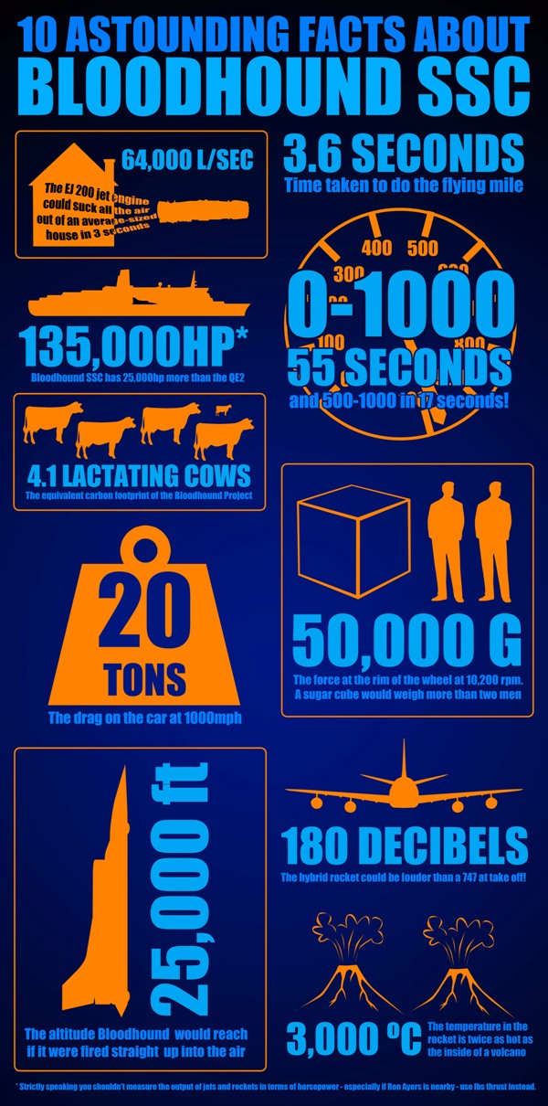 Englische Ingenieure wollen den Landgeschwindigkeitsrekord brechen und bauen zurzeit an einem Raketenauto, dem Bloodhound Super Sonic Car, das erstmals schneller als 1.000 Meilen pro Stunde – das entspricht mehr als 1.600 km/h – fahren soll. Der Rekord soll Ende des Jahres oder Anfang nächsten Jahres in einer südafrikanischen Wüste aufgestellt werden. 135.000 PS wird das Fahrzeug haben; das ist so viel wie die Leistung von 90 Formel-1-Boliden. Und es wird in 55 Sekunden von 0 auf 1.000 mph beschleunigen. Dafür sorgen ein Raketen- und ein Jettriebwerk, die zurzeit auf einem ehemaligen Flugplatz in Cornwall getestet werden. Der eingebaute 750-PS-starke V8-Cosworth-Motor, der normalerweise Rennwagen antreibt, dient bei diesem Geschoss lediglich dem Betrieb von Treibstoffpumpe und Wagenhydraulik.