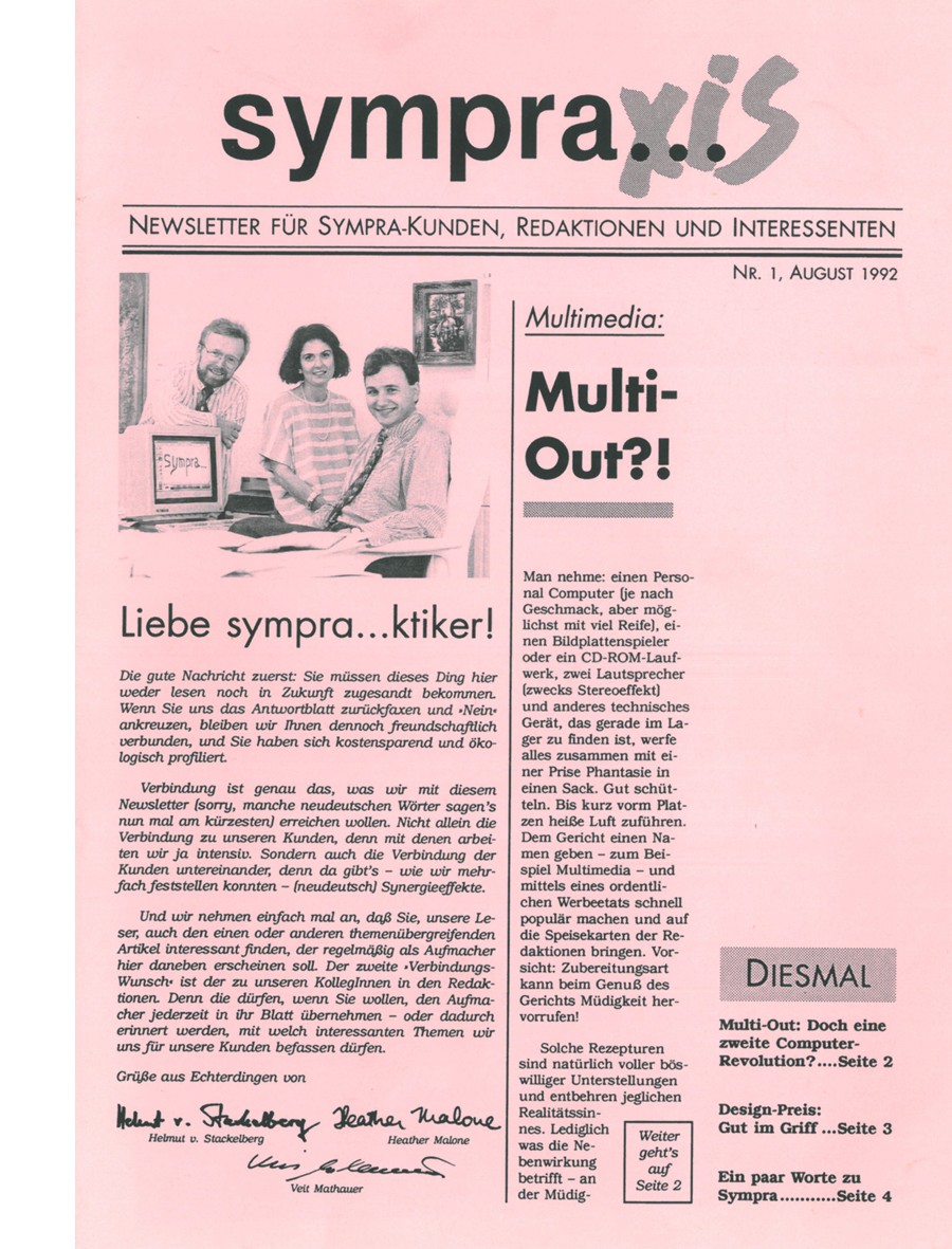 Vor genau zwanzig Jahren, an ebenfalls schönen, warmen August-Tagen, haben wir die erste Ausgabe unseres Newsletters „sympraxis“ produziert. Das Unternehmen war gegründet, die Kundenprojekte machten ein kleines bisschen Sommerpause, da wollten wir uns mit „etwas Gedrucktem“ bei Freunden, Kunden und Geschäftspartnern melden. Die Struktur des Vierseiters blieb von damals bis zur letzten gedruckten Ausgabe 2007 erhalten: Auf der Seite 4 wurden in einer Rubrik namens Watchlist immer (neue) Mitarbeiter vorgestellt – in dieser ersten Nummer gaben wir der Firmenmitgründerin Heather Malone den Vorrang.![]()
