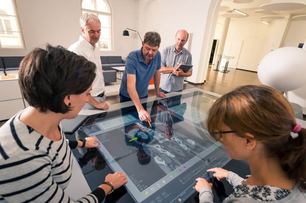 In dem interdiziplinären Forschungsverbund beschäftigen sich Wissenschaftler mit kognitiven Interfaces, also den Bedienoberflächen, über die Menschen und Maschinen miteinander kommunizieren. Im Fokus steht die Frage, wie diese Schnittstellen gestaltet sein müssen, damit sie das Denken, Handeln und Arbeiten verbessern. Eines der spannenden Projekte ist der interaktive Visitetisch, bei dem es um die mit Arztbriefen, Laborberichten, Radiologieaufnahmen und sonstigen Dokumenten prall gefüllten Patientenakten geht. Aus diesem Datenwust müssen Mediziner nämlich die Fakten herausfiltern, die relevant sind, um zu einer richtigen Diagnose zu kommen. Eine komplexe Aufgabe, die nochmals verschärft wird durch den hohen Zeitdruck im Klinikalltag mit ständig wechselnden Patienten.