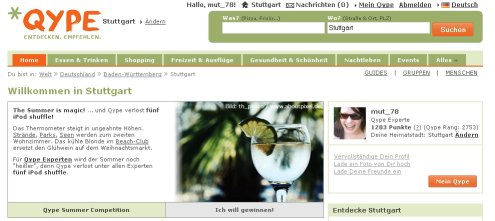 Seit Dezember 2007 qype ich. Qype ist ein Bewertungsportal für öffentliche Plätze auf der ganzen Welt. Begeistert davon, dass viele Läden und Plätze in meinem Stadtteil noch nicht bewertet und beschrieben wurden, verfasste ich neue Beiträge, habe mir Listen mit meinen Lieblingsplätzen angelegt, mich mit anderen Usern ausgetauscht, kommentiert und Komplimente vergeben. Ich habe mich über das Insider-Paket mit grünem T-Shirt gefreut, das man erhält, wenn man 250 Qype-Punkte und 15 Bewertungen geschrieben hat, habe fleißig weiter bewertet und bin schließlich mit 1.000 Punkten Qype-Experte geworden.
