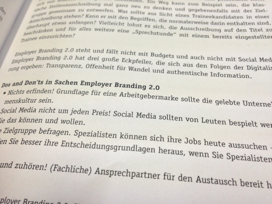 Strike! Gleich bin ich durch. Aber dann kommt da schon wieder so ein interessantes Kapitel daher: “Wie angelt man sich als Mittelständler einen Ingenieur?” von Christine Oertel. Das wollen unsere Kunden ja auch immer wissen! Besonders als Automobilzulieferer stehen Unternehmen immer im Schatten der großen Automobilhersteller. Vor dem Problem stand auch die in-tech GmbH. Um die Arbeitgebermarke zu stärken und qualifizierte Ingenieure zu gewinnen, hat in-tech ein schlüssiges Kommunikationskonzept entwickelt. Über verschiedene Kanäle werden Kontakte geknüpft und gehalten , das Unternehmen wird erlebbar gemacht und “interne” Informationen z.B. zum Wertesystem von in-tech werden vorgestellt. In drei Schritten wurde das Konzept umgesetzt: