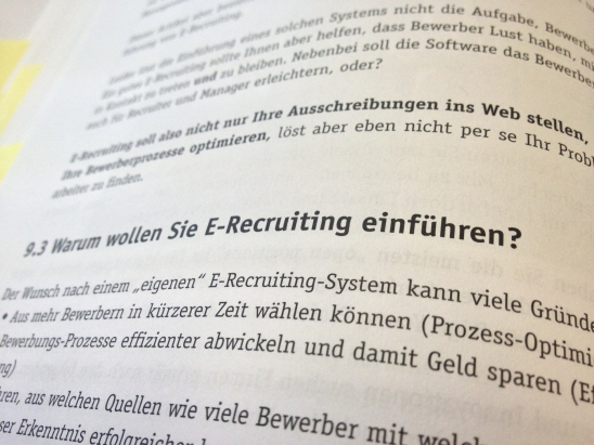 Andreas Fritz macht es mir mit “Aspekte moderner E-Recruiting-Systeme” einfacher. Diese eignen sich so richtig gut für große Unternehmen, die sehr viele Stellen zu besetzen haben und so ihre Prozesse effizienter gestalten wollen und auch eine bessere Analyse der Bewerber vornehmen möchten. Fritz zeigt Fallstricke bei der Einführung einer solchen Software auf und bietet dem Leser konkrete Tipps und Handlungsempfehlungen. Lesenswertes Kapitel für alle, die gerade mit dem Gedanken spielen, E-Recruiting-Systeme einzuführen.