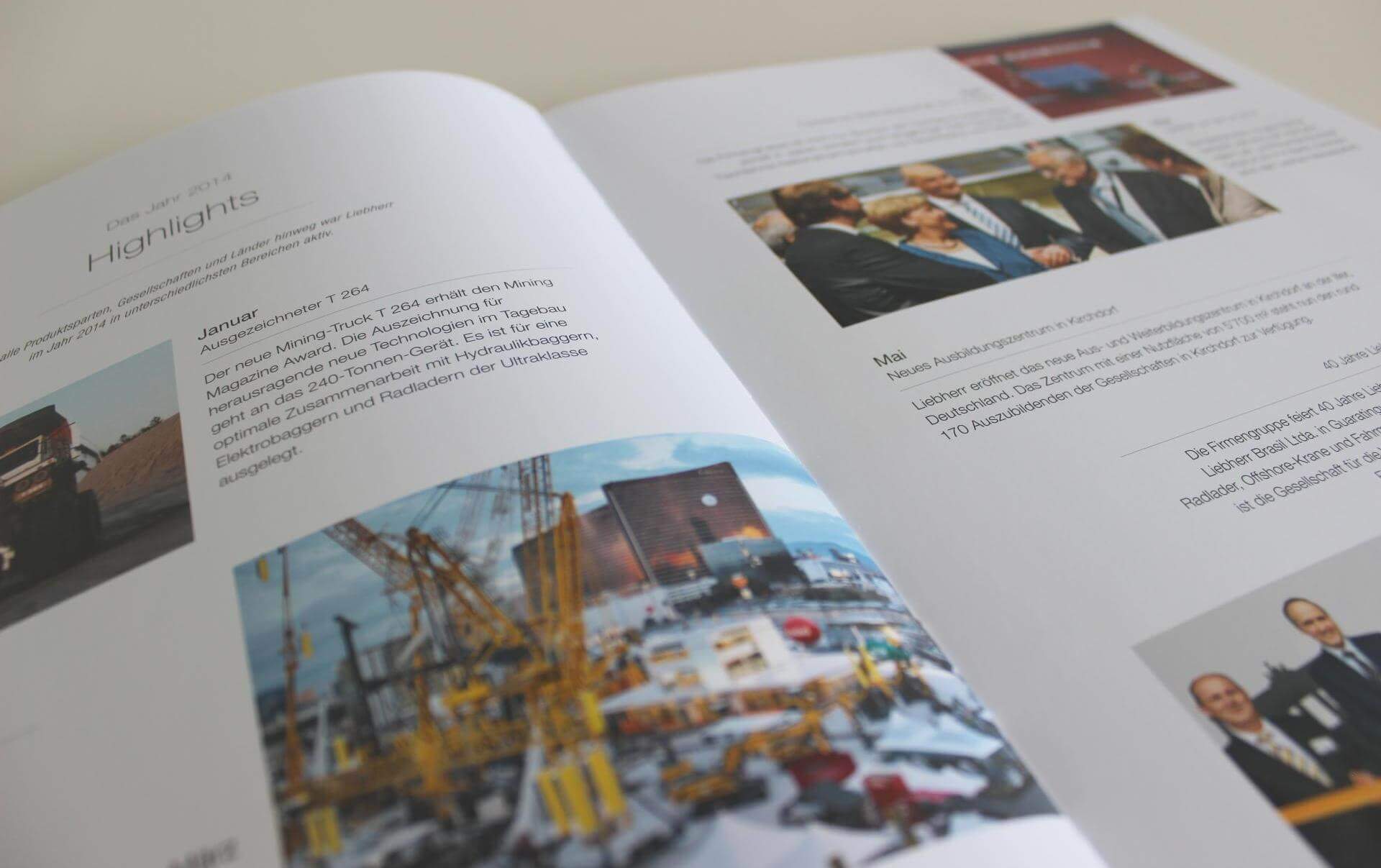 Kühle Zahlen anschaulich erklärt: Sympra unterstützt die Fakten des aktuellen Liebherr-Geschäftsberichts mit spannenden Feature-Texten im Magazinteil. Dazu zählen technisch orientierte Interviews mit Liebherr-Experten zu Produktneuheiten genauso wie ansprechende Geschichten rund um die Entwicklung der Firmengruppe Liebherr und ihrer Positionierung als Innovationstreiber auf zahlreichen Gebieten.
