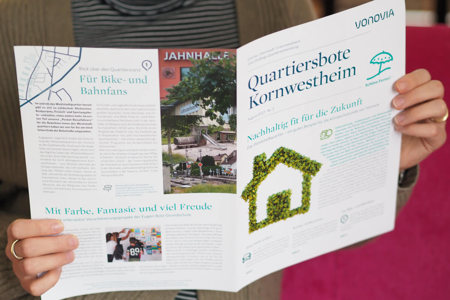 Passgenaue Kommunikation gelingt mit dem Quartiersboten, einem Newsletter der besonderen Art, der dreimal im Jahr erscheint. Neben den Updates zum Stand der Sanierungsarbeiten erfahren die Mieter:innen beispielsweise Wissenswertes zum Carsharing-Angebot, erhalten Infos zum Müllsystem oder bekommen einen Einblick, welche politischen Stakeholder im letzten Quartal zu Besuch im Quartier unterwegs waren. Fester Bestandteil ist dabei auch die Rubrik „Blick über den Tellerrand“, in der den Quartiersbewohner:innen die Umgebung rund um ihr Wohnviertel vorgestellt wird. In enger Abstimmung mit dem Vonovia-Team vor Ort und der Unternehmenskommunikation ist Sympra für den gesamten redaktionellen Prozess des Newsletters verantwortlich: Themenplanung, Recherche und Briefings durch die jeweiligen Ansprechpartner:innen, verfassen der Texte und Abstimmung derselben. In Zusammenarbeit mit einem Grafiker sorgen wir zudem für ein ansprechendes, neugierig machendes Design entsprechend den CD-Richtlinien des Wohnungsunternehmens.