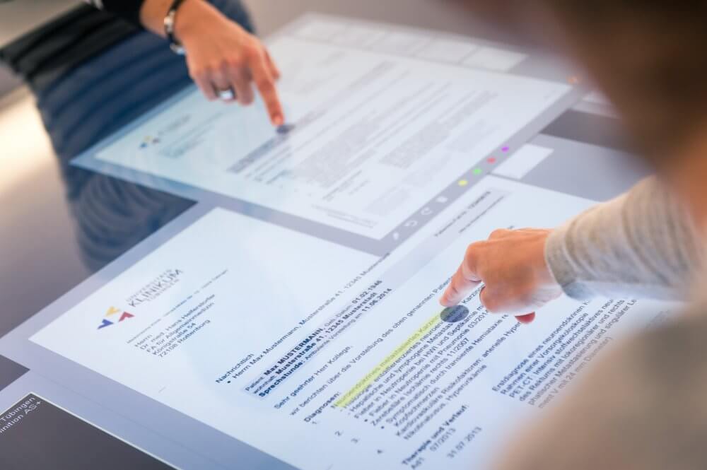 Der Prototyp des Visitetischs sieht im inaktiven Zustand aus wie ein normaler Tisch mit dunkler Glasplatte. Wird er angeschaltet, verwandelt sich die gesamte Oberfläche in ein Multi-Touch-Display. Die für das Projekt digitalisierten Patientenakten werden mit einfachen Gesten wie Ziehen oder Drehen gesteuert. Parallel lassen sich mehrere Dokumente öffnen und thematisch gruppieren. Zum ersten Mal können Ärzte in der Datenflut nach Stichworten suchen, die Wichtigkeit einzelner Dokumente festlegen und interessante Werte oder Textpassagen farbig markieren. In Zukunft könnte die digitale Technik die Ärzte dabei unterstützen, die vielen Puzzleteile aus den Patientenakten zu einem stimmigen Gesamtbild zusammenzusetzen, um sich für die richtige Diagnose und Behandlung zu entscheiden. Das wäre auch ein Schritt auf dem Weg zur digitalen Transformation im Gesundheitswesen.