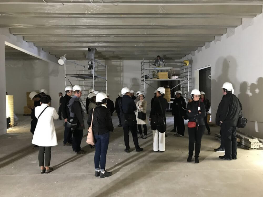 In Weimar wurde 1919 das Bauhaus gegründet. 2008 haben der Bund und das Land Thüringen die Klassik Stiftung Weimar mit dem Bau eines neuen Bauhaus-Museums beauftragt. Den internationalen Architekturwettbewerb hat Prof. Heike Hanada, laboratory for art and architecture in Berlin, gewonnen – 536 Architekturbüros hatten ihre Beiträge eingereicht. Die Bauarbeiten begannen im November 2015, zum 100-jährigen Gründungsjubiläum des Bauhauses wird das bauhaus museum weimar am 6. April 2019 eröffnen. Prof. Hanada führte uns durch die weit fortgeschrittene Baustelle, erläuterte uns ihr Konzept, das Museumsgebäude als Verbindung zwischen dem Gau-Forum, einem Relikt der NS-Zeit, dem Stadtpark und der Innenstadt zu platzieren. Eine Besonderheit des Kubus ist seine vorgehängte Betonfassade: 400 Stahlbetonelemente aus weißem Zement werden derzeit montiert; später sollen integrierte LED-Bänder für Lichteffekte sorgen. Sehr beeindruckend, wie präzise die gerillten Elemente gestapelt am Gebäude verankert werden. Ein Museum in Betonoptik also? Das ist noch nicht ganz klar: Denn eigentlich soll (oder sollte) vor die Betonfassade eine Glasfassade gehängt werden, was meines Erachtens dem Gebäude ein komplett anders Aussehen geben würde. Da sich die Bauherren das Ganze inzwischen aber auch ohne Glas vorstellen könnten, wird noch einmal neu diskutiert. Dabei geht’s diesmal nicht in erster Linie ums Geld, sondern tatsächlich um die Ästhetik. Im November 2018 soll final entschieden werden – die Eröffnung im Frühjahr 2019 erfolgt aber auf jeden Fall ohne Glasfassade!
