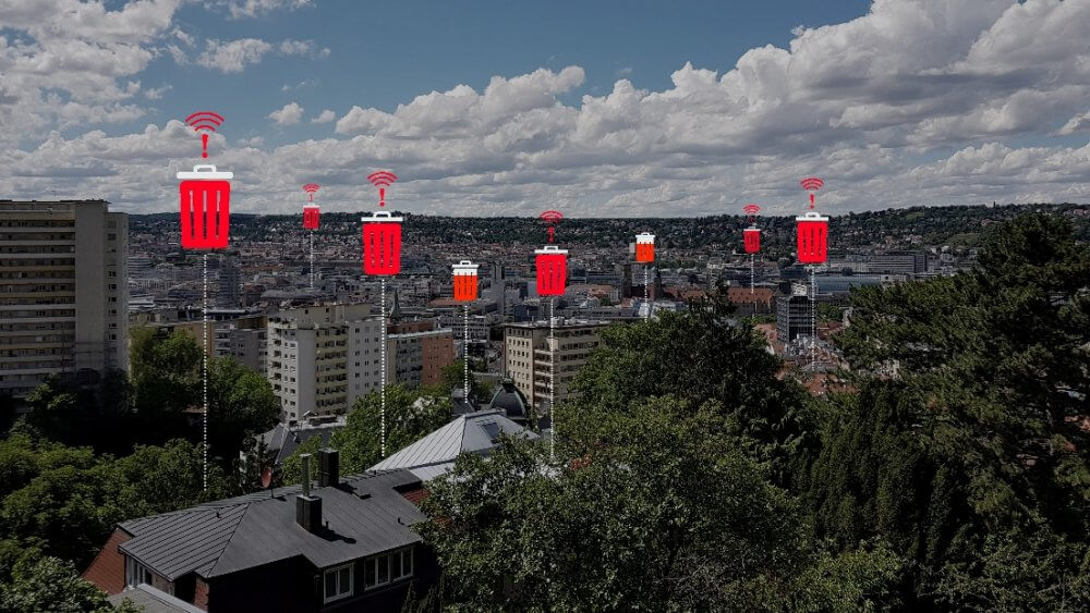Im Internet der Dinge (der Mülleimer ist genau so ein „Ding“) funken Gegenstände Statusinformationen über eine eigens dafür aufgebaute Funkinfrastruktur. Diese sogenannten Low-Power-Netzwerke übertragen Datenpakete mit – der Name sagt’s – niedrigem Energieverbrauch. Mit sehr überschaubarem Aufwand lassen sich so große Gebiete abdecken, z. B. ein Betriebshof oder eine komplette Innenstadt. Die erfassten Messwerte und Daten werden auf einer zentralen Plattform gebündelt, ausgewertet und visualisiert. Prozesse können auf diese Weise bestmöglich optimiert und neue digitale Services entwickelt werden. Die Einsatzmöglichkeiten sind vielfältig, hier einige Beispiele: