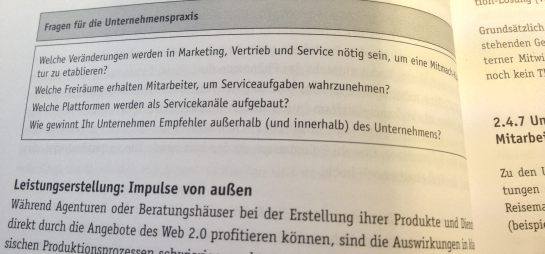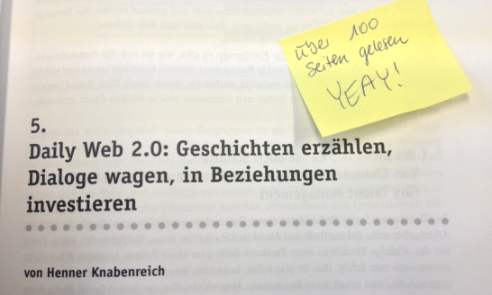 Ich hab 100-Seiten Marke geknackt und es geht weiter mit einem Beitrag von Henner Knabenreich “Daily Web 2.0: Geschichten erzählen, Dialoge wagen, in Beziehungen investieren”. Knabenreich schreibt von den Chancen und Risiken von Social Media und wird mit Beispielen dann auch konkret: Wie kann man sich auf XING präsentieren? Wie funktioniert Recruiting auf Facebook? Wie können Blogs, YouTube und auch Twitter dem Unternehmen ein Gesicht geben? Sehr interessantes Kapitel mit vielen Praxisbeispielen. Hat mir gut gefallen.