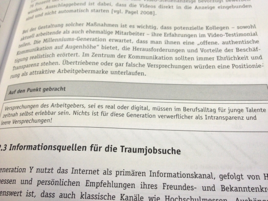 Mit dem Kapitel “Orientierung tut not! Talent Recruiting-Maßnahmen auf dem Prüfstand” von Salmen und Bieber, nähere ich mich den 200 Seiten und bin ein bisschen stolz auf mich. Aber das Kapitel ist ganz schön happig: ein Diagramm jagt das nächste, Zitate aus Studien und Fragebögen inklusive. Dennoch finden sich hier Empfehlungen, wie ein Unternehmen den “War for Talent” im Social Web gewinnen können: mithilfe von Unternehmensbotschaftern, der richtigen Instrumentenauswahl und einer guten Strategie.