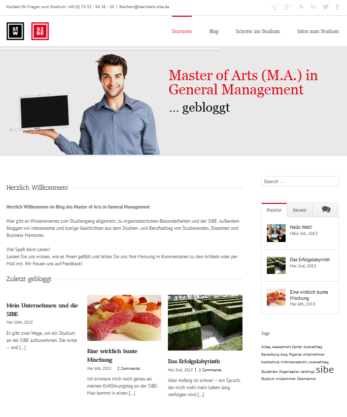 Unser Kunde, die Steinbeis School of International Business and Entrepreneurship (SIBE), bietet bereits seit einigen Jahren berufsintegrierte Masterprogramme an. Bei dem steigenden Angebot an Studiengängen wird es zunehmend schwieriger, aus der Masse heraus zu stechen – dabei ist der Master of Arts in General Management etwas ganz Besonderes: Hinter diesem Studiengang verbirgt sich ein berufsintegrierter Studienmodus, gepaart mit dem SIBE-spezifischen Projekt-Kompetenz-Studium. Berufsintegriert bedeutet, dass die Seminare nicht nach Feierabend stattfinden, sondern ganztägig und ebenso als Arbeitstag anzusehen sind. Das Projekt bildet den Mittelpunkt des Studiums, denn es ist einerseits Gegenstand der Hausarbeiten und die konkrete Planung und Umsetzung nehmen andererseits einen festen Anteil des Arbeitsalltages in Anspruch. Dadurch ergibt sich die enge Verzahnung von Theorie und Praxis, die sich die SIBE zum Ziel gesetzt hat. Die dritte Komponente bilden die Kompetenzen, die während des Studiums durch Trainings und 360°-Feedback gezielt gefördert werden. Wie sich an dieser Stelle zeigt, lassen sich die Besonderheiten dieses Studiengangs nur schwer in wenigen Sätzen zusammenfassen. Aus diesem Grund wurde der Blog ins Leben gerufen.