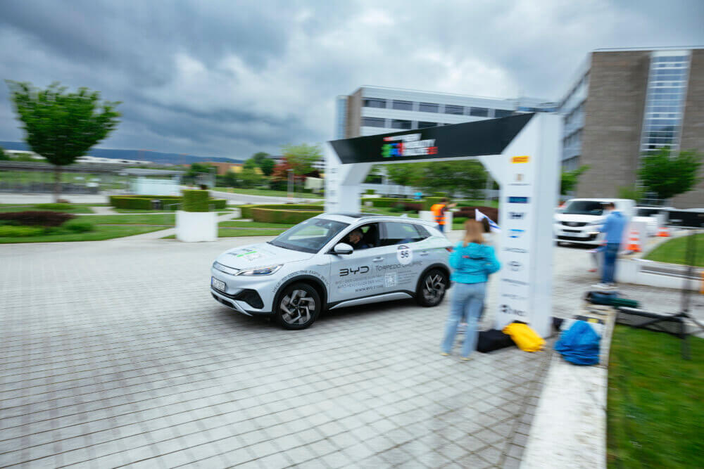 Unser Sympra-Team, darunter Christoph Miller, Louisa Becker und ich – Stefanie Bäuerle – war ebenso wie unser Kunde bereits am Vortag für die Rallye nach Walldorf gereist. Der weltweit größte Produzent von Fahrzeugen mit Elektroantrieben, BYD, gehörte zu den Sponsoren des Events und durfte deshalb gleich drei Fahrzeuge auf der Strecke präsentieren. Auf das erste Team, Lars Pauly und Jan Grindemann, CEO und COO von BYD-Importeur Hedin Electric Mobility, trafen wir bei der Registrierung. Erwartungsvolles Händeschütteln, ein paar feixende Sprüche. Am Abend verstärkte sich die Vorfreude auf den Wettbewerb: Unter den rund 130 Teilnehmenden, die für die Begrüßung des Veranstalters zusammengekommen waren, entdeckten wir bald Ugur Cicek und Marc Noppenberger des BYD-Händlers Torpedo aus Mannheim. Bestärkt durch den Austausch mit Henning Busse, dem leitenden Redakteur der Moove, hatten wir das Gefühl, dass unser aller Sieg nichts mehr im Weg steht.