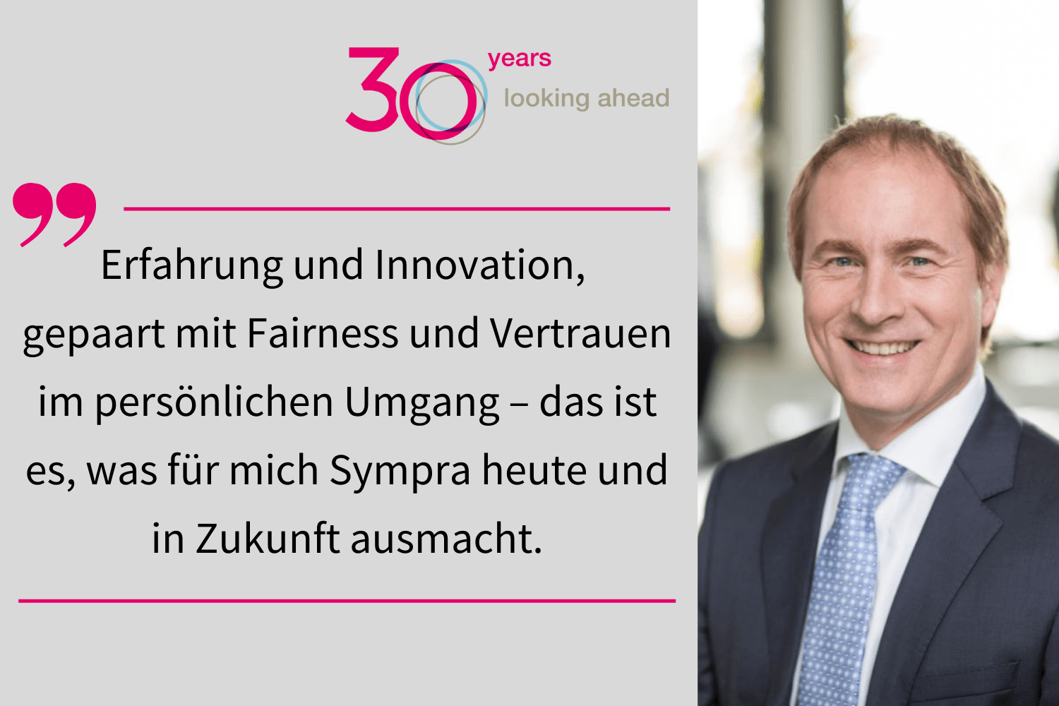 Das war im Rückblick betrachtet viel wichtiger. Denn in der Pfalz begründete sich mein persönlicherer Kontakt zu Sympra. Auch als ich längst auf die PR-Seite gewechselt war, blieben wir in Kontakt, z. B. über die immer individuellen und persönlichen Weihnachtsgrüße von Sympra. So war es irgendwie nur folgerichtig, dass ich später das Münchner Büro der Agentur eröffnete. Das leite ich schon einige Jahre – und es macht mir auch im 30. Jahr von Sympra viel Spaß, mit den Kolleginnen und Kollegen zusammenzuarbeiten: mit den Älteren, die ich schon fast so lange kenne, wie die Agentur besteht. Und mit den Jüngeren, die neue Impulse z. B. beim Thema Nachhaltigkeit und gendergerechte Sprache einbringen. Erfahrung und Innovation, gepaart mit Fairness und Vertrauen im persönlichen Umgang – das ist es, was für mich Sympra heute und in Zukunft ausmacht.