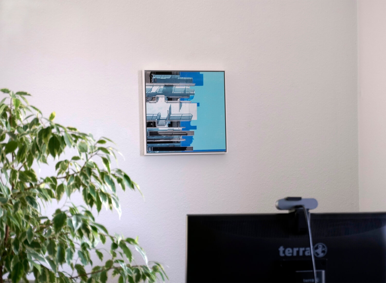 Den besonderen Effekt, den diese kuratorische Übung auf mich hatte, war die präzisere Wahrnehmung meiner Umgebung. Die Frage nach dem geeigneten Ort für das Kunstwerk veranlasste mich umgehend zu weiteren Fragen: Was sehe ich von meinem Schreibtisch aus? Was sieht die Person, die meinen Arbeitsraum betritt als erstes? Was sehen die Personen, mit denen ich im Video-Call spreche, hinter meinem Rücken? Für mich als Betrachterin ist die Herausforderung, immer wieder neue Perspektiven und keine gewohnten Standpunkte einzunehmen, eine wertvolle Stütze, um beispielsweise Kommunikationsstrategien zu erstellen. Denn auch dafür ist es wesentlich, Themen von außen, aus der Sicht der Zielgruppen zu betrachten.
