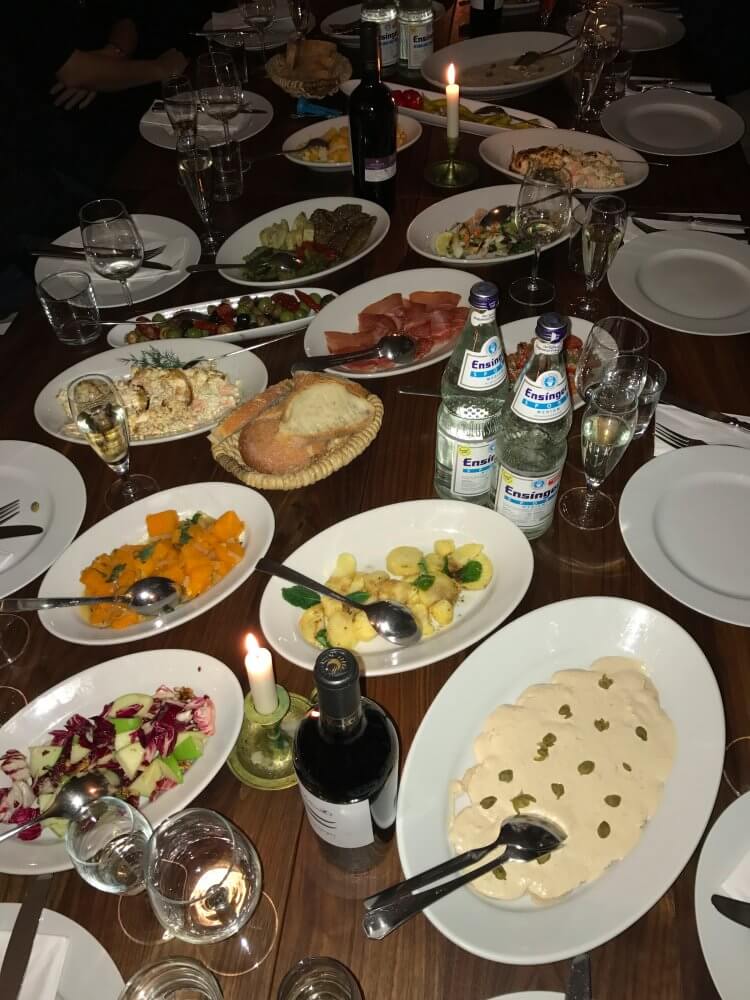 Sympra verbindet mit dieser Location die Erinnerung an schöne Feste, vor allem Agenturweihnachtsfeiern. Keine Ahnung, wie oft wir in den vergangenen fünfundzwanzig Jahren dort gefeiert haben. Da wir fast jedes Jahr dort waren, dürften es mindestens 15-18 Mal gewesen sein. Loretta ist die perfekte Gastgeberin: Nach dem Begrüßungsprosecco geht’s los mit riesigen Antipasti-Platten, die eigentlich alleine schon die Mannschaft stattmachen könnten. Danach hausgemachte Pasta, mindestens drei Sorten und drei Saucen. Jetzt der Hauptgang samt Beilagen („Ich habe Kaninchen und Hühnchen, soll ich Euch auch noch Fisch machen?“). Wenn man glaubt, man sei nun endgültig an seiner Kapazitätsgrenze angelangt – Fehlanzeige: Zum Abschluss kommt jede Menge Nachtisch, zu erwähnen u. a. eine Kalorienbombe, bestehend aus Sahne, Mascarpone und Früchten, die so lecker schmeckt, dass auch sie noch wegkommt. Dazu wunderbaren Hauswein, Grappa … Sympraweihnachtsfeiern ziehen sich daher meist bis in den frühen Morgen. Schon traditionell: „Ich lasse Euch den Schlüssel da; schließt ab und werft ihn mir in den Briefkasten!“